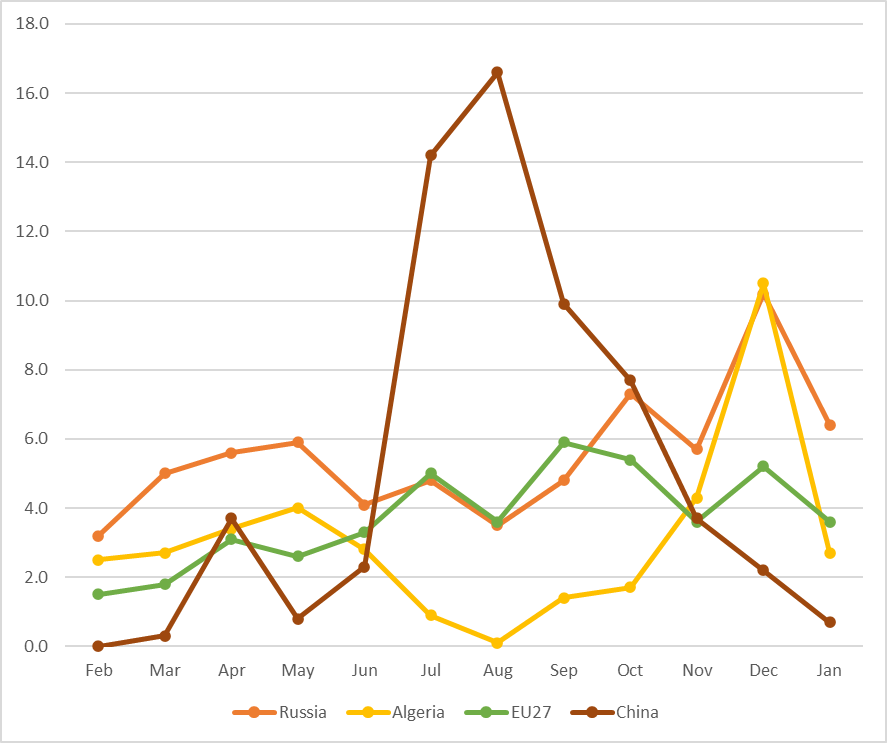 Esse movimento costuma ocorrer mais cedo, por volta de dezembro. No entanto, o grande volume exportado para Rússia e Argélia em dezembro — provavelmente resultado da necessidade de produtores e exportadores venderem a mercadoria antes da chegada da nova safra — fez com que dezembro de 2025 se tornasse o mês com o maior volume exportado da história do Brasil. Agora observamos o ajuste. Mesmo assim, janeiro de 2026 registrou um volume maior do que janeiro de 2025, como pode ser visto no gráfico acima.