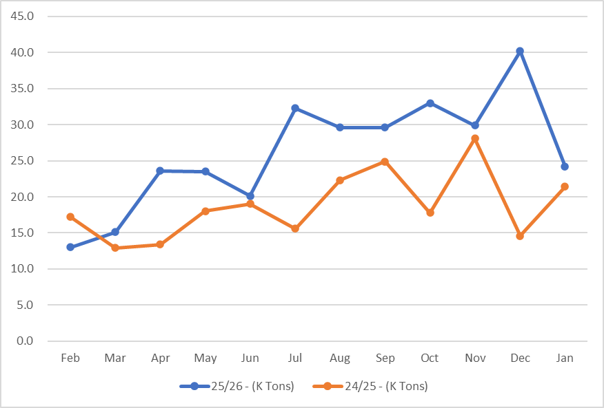 O número de janeiro se soma a um total de 286 mil toneladas exportadas desta safra (abril/25 até o momento).