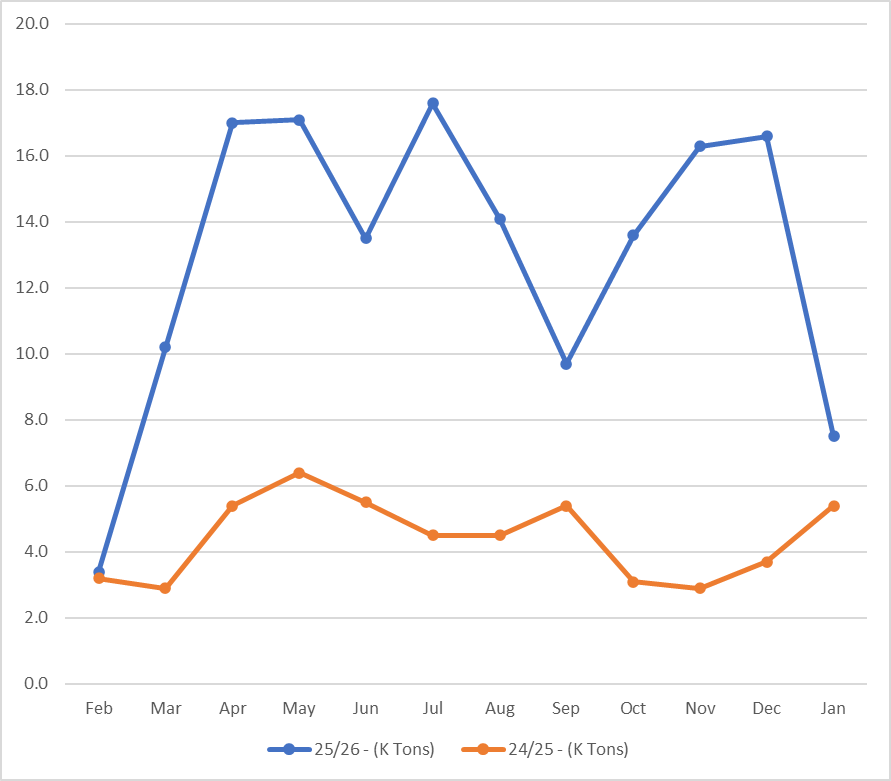 For now, as we only have one month of data in 2026, we will analyze the exports of 25/26 compared to 24/25:
