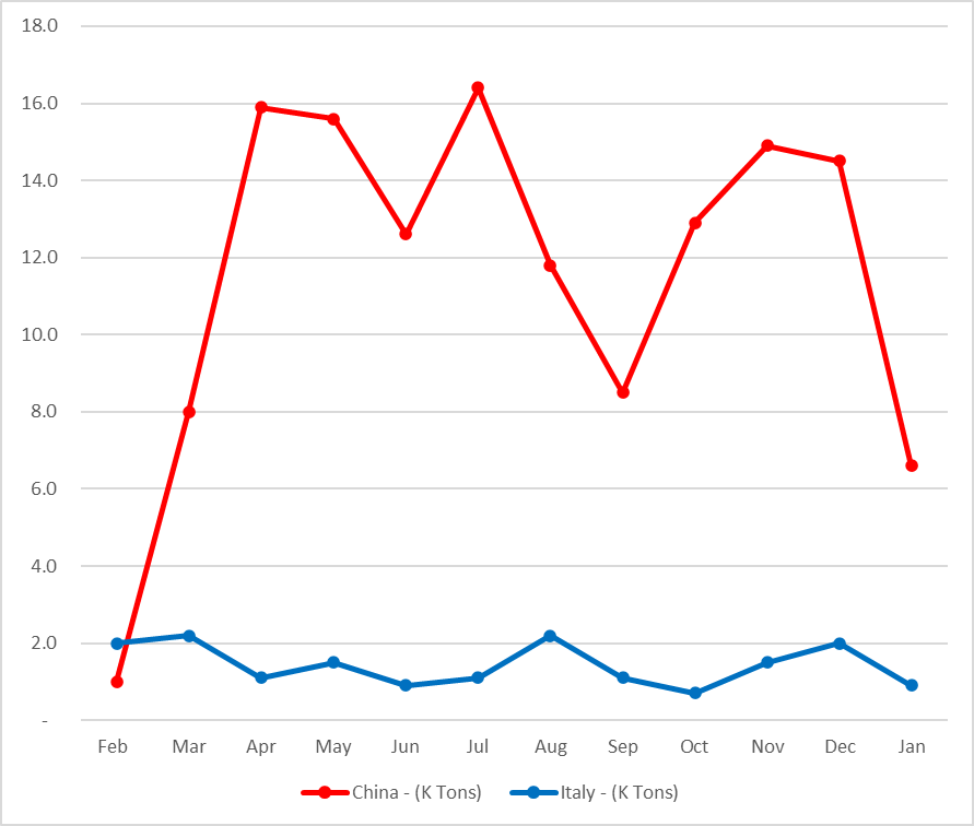 Both Italy and China decrease its imports, but obviously the main decrease is by China.