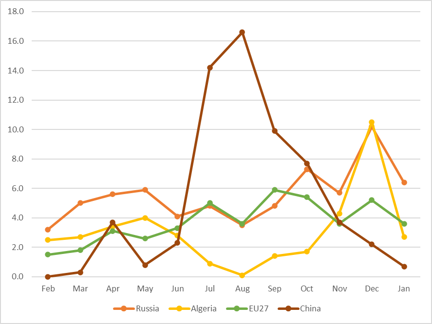 All the main export destinations have decreased its imports, the steepest decrease being Algeria, going from 10 to 3 thousand tons.