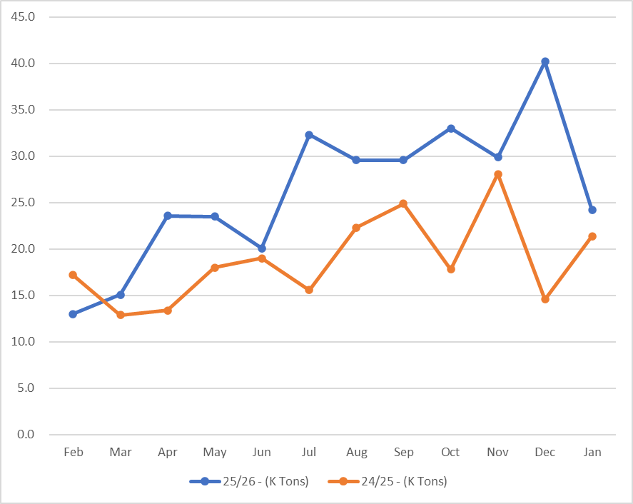 The January figure adds to a total of 286 thousand tons exported from this crop (April 25 – Now).
