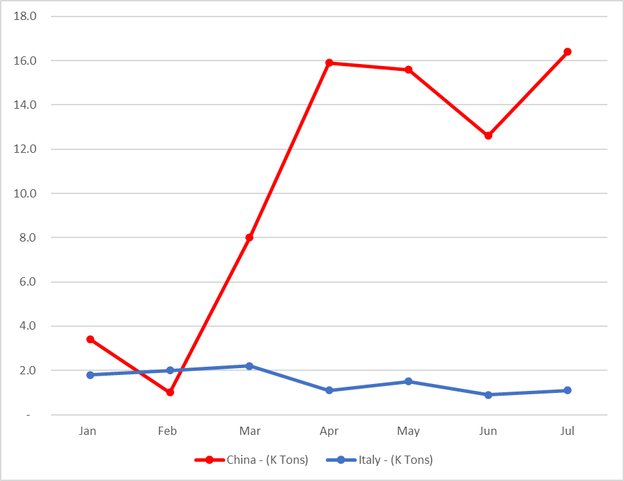 Como de costume, as oscilações nas exportações de óleo de amendoim se devem às importações chinesas, com 16,4 mil toneladas. As importações italianas permaneceram estáveis em 1,1 mil toneladas.