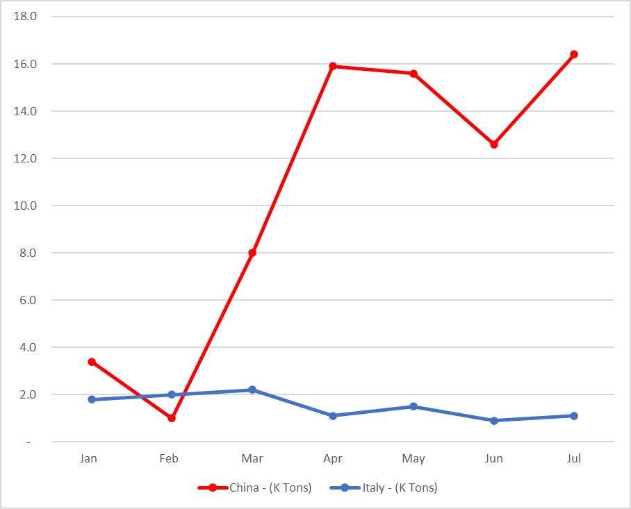 As usual, the fluctuation in peanut oil exports were due to Chinese imports, with 16,4 thousand tons. Italian imports remained still at 1,1 thousand tons.
