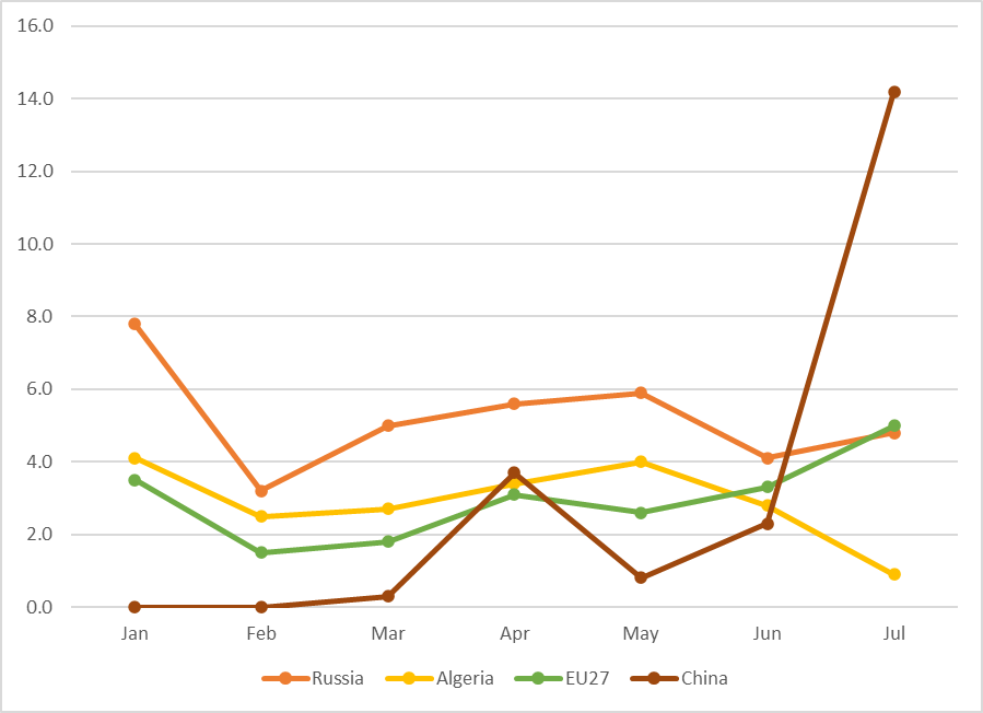 Algeria imports are decreasing still. Russia has increased about one thousand tons. EU increased about 1,7 thousand tons, most likely a result of contracts being fulfilled. And China hovering above with its 14 thousand tons.