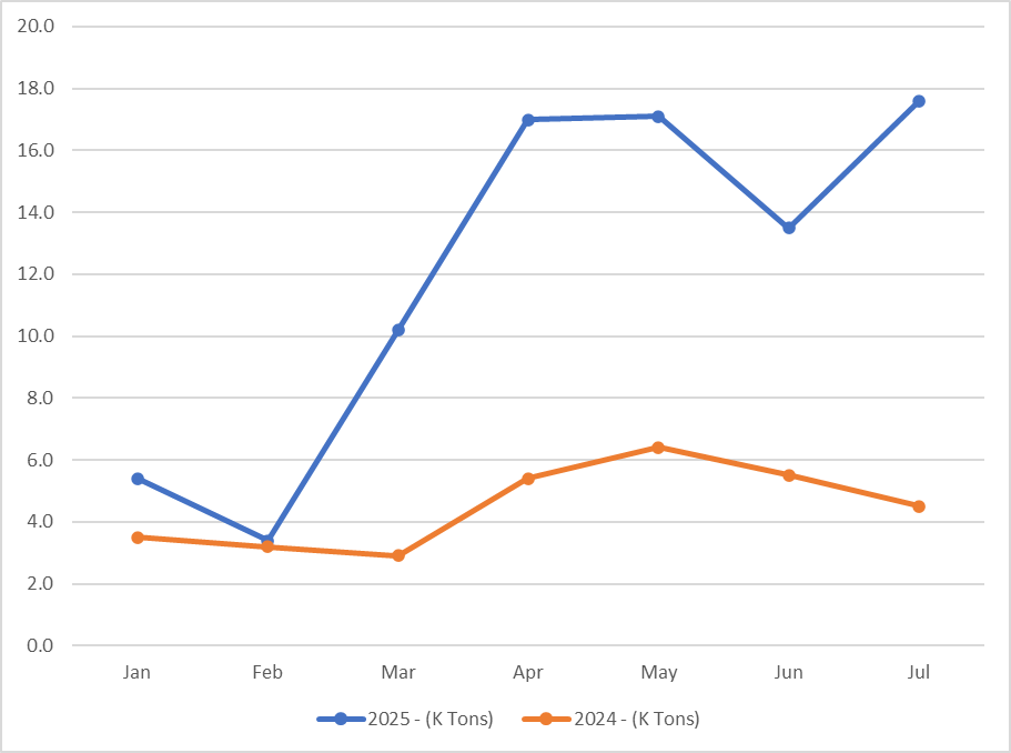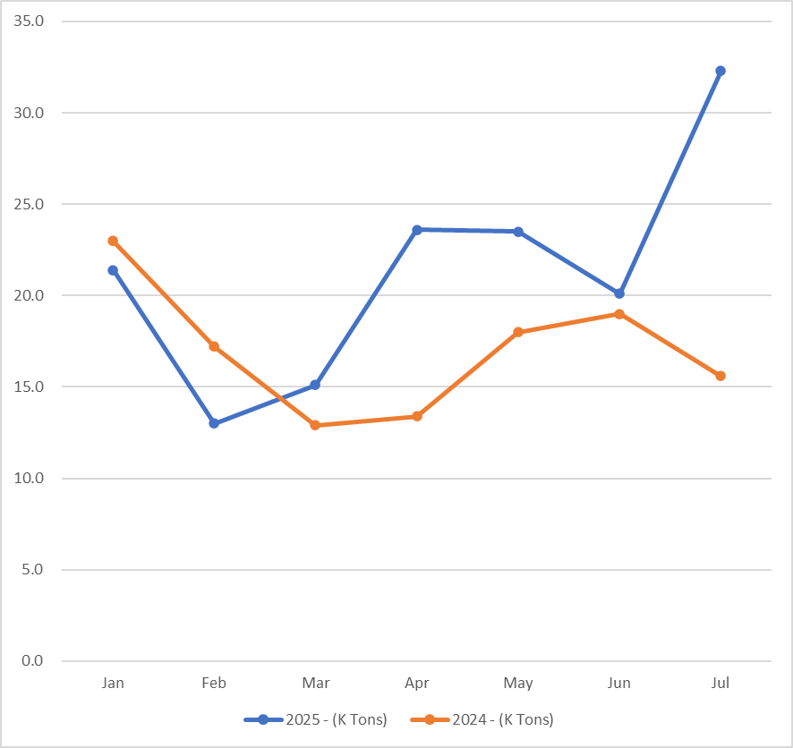 During July, Brazil exported 32 thousand tons of peanuts, this represents a 60 % increase compared to May 25. And a 107% increase compared to July 2024. Although this is a very good number for exports, the question of what will happen when the Chinese demand slows down is concerning. Without the 14 thousand tons to China, Brazil is left with 18 thousand tons exported in July.