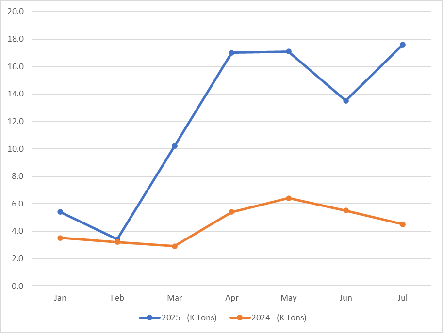 As exportações brasileiras de óleo de amendoim em julho foram de 17,6 mil toneladas, um aumento de 30% em relação ao mês passado e um incrível aumento de 291% em comparação a julho de 2024.