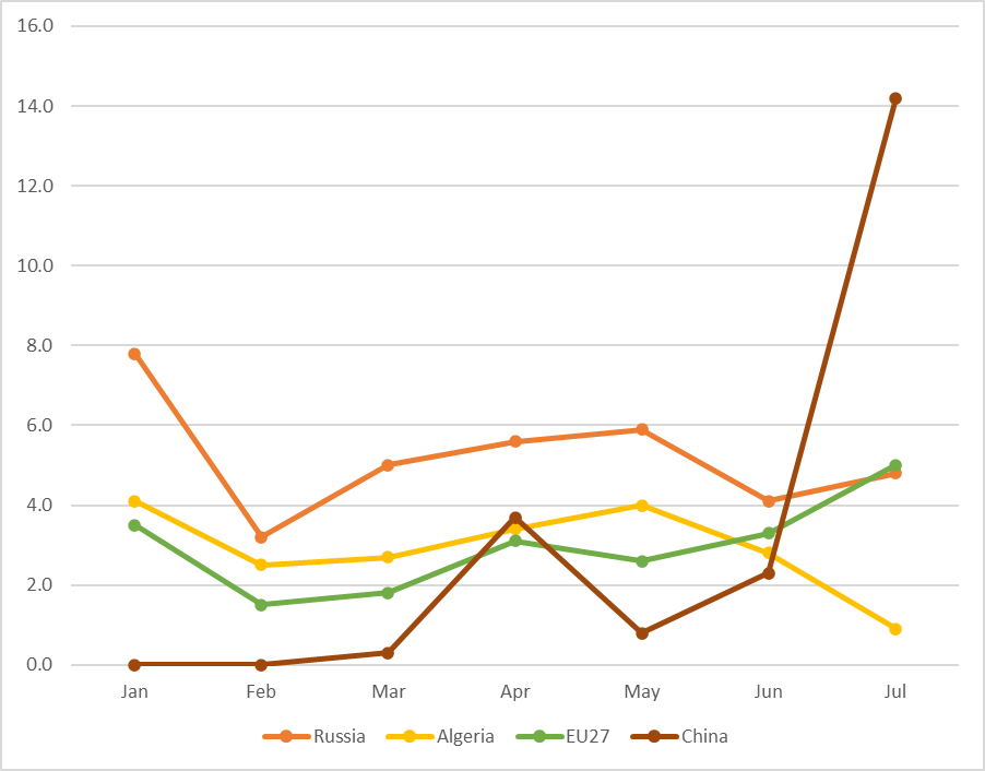 O gráfico de destinos, agora muito distorcido pelas importações chinesas, vem confirmar as últimas interpretações de mercado: as importações da Argélia continuam caindo. A Rússia aumentou cerca de mil toneladas. A União Europeia aumentou cerca de 1,7 mil toneladas, muito provavelmente como resultado apenas do cumprimento de contratos. E a China permanece no topo com suas 14 mil toneladas.