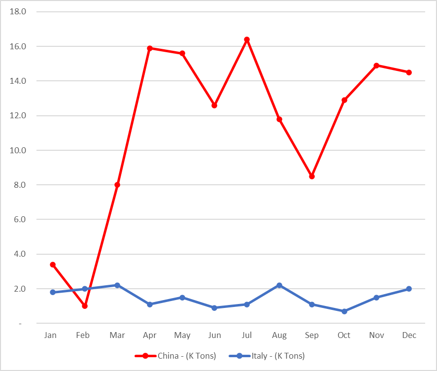 Regarding the destination of the peanut oil, Chine decrease its imports very slightly, while Italy increased in similar amounts.