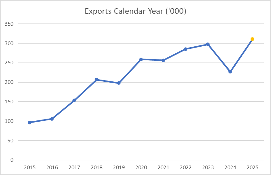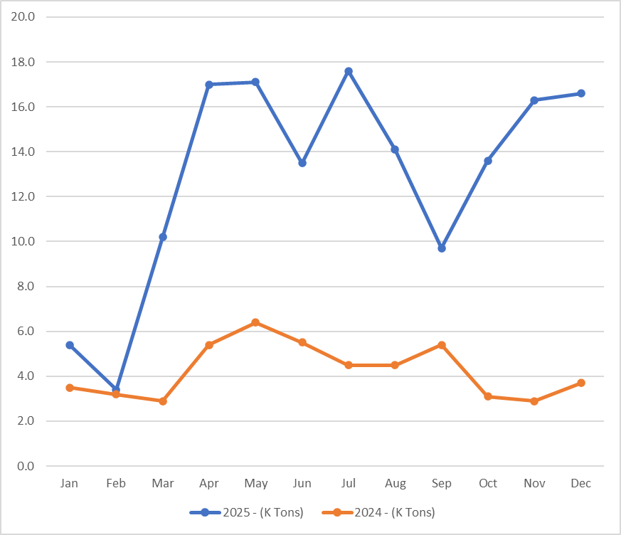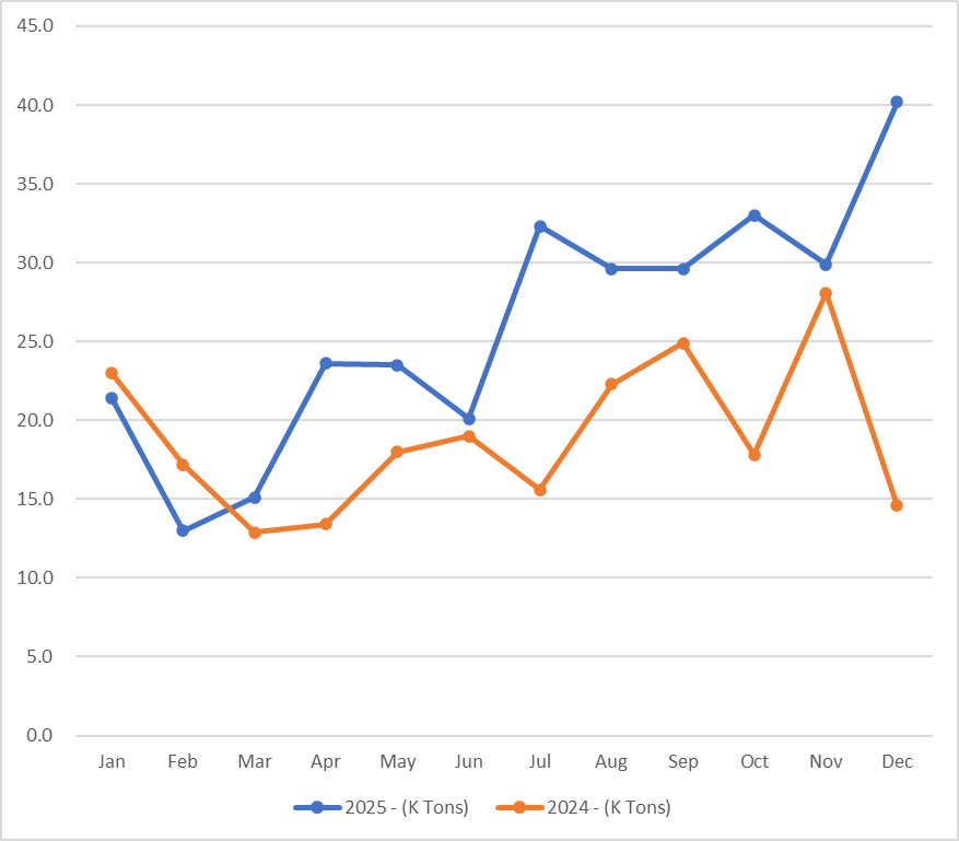 Enquanto as exportações para a China continuam em queda, com BIDs cada vez mais baixos por parte dos compradores chineses, as exportações para a Rússia e para a Argélia deram um grande salto, alcançando 10 mil toneladas durante o último mês de 2025.