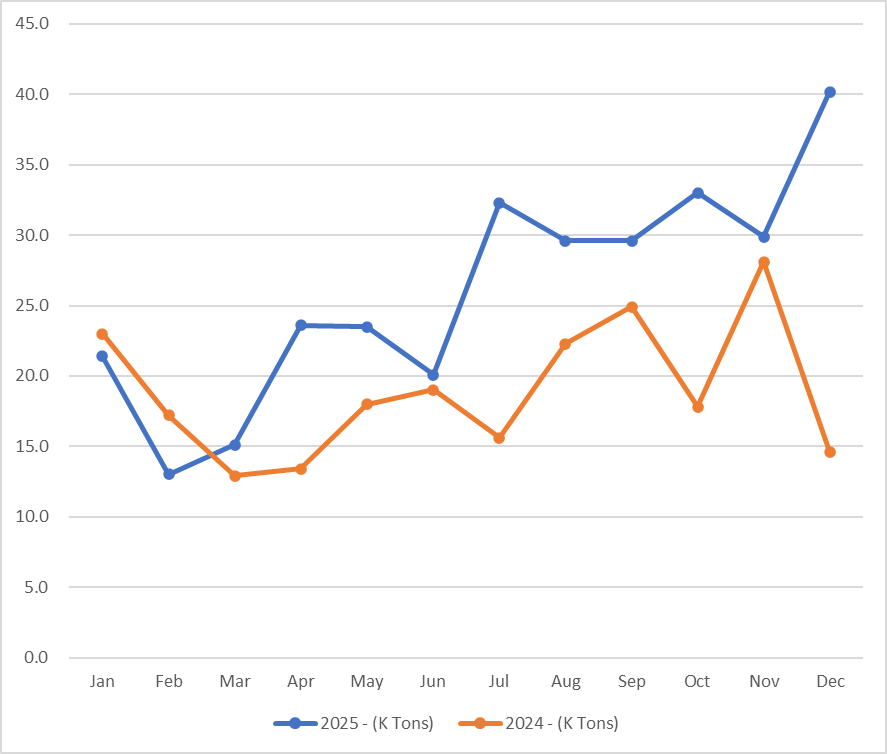 The December figure adds to a total of 311 thousand tons exported year to date, and 261 thousand tons crop year (April – now) so far. This means a record year for kernel exports, surpassing 2023.
