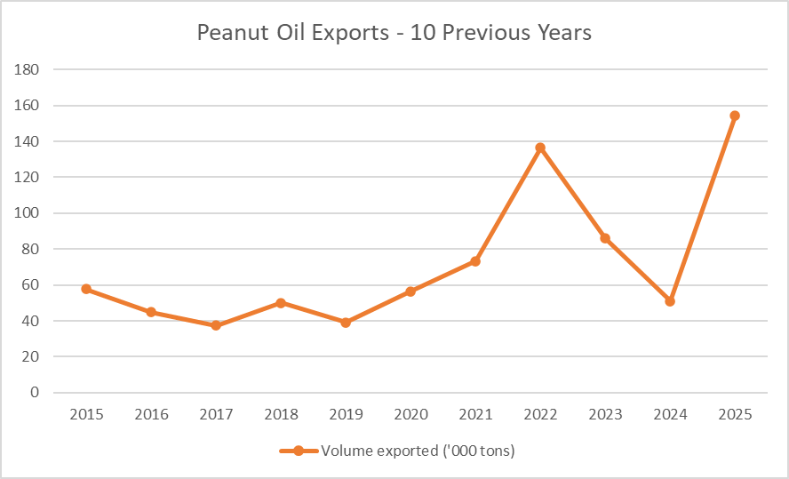 Exportações de óleo de amendoim nos últimos 10 anos.