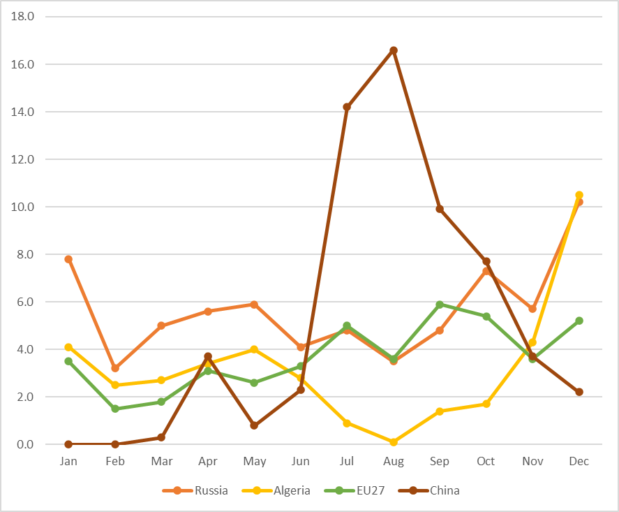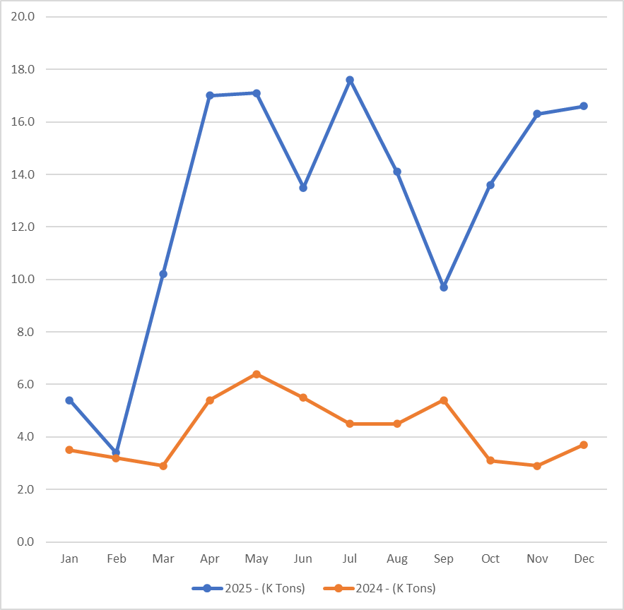 While exports to China keep going down, with BIDs lower and lower from the Chinese, exports to Russia and Algeria took big leaps, reaching 10.000 tons during the last month of 2025.