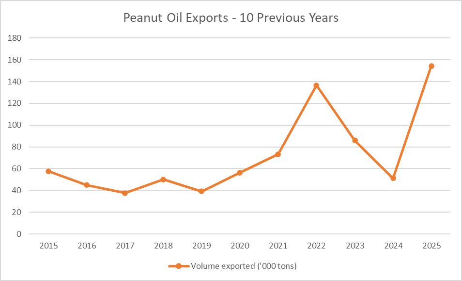 One more month of increase in the peanut oil side, this time a much slighter increase, nevertheless a very significant number of about 16 thousand tons. One more big number that now add to a total of 154 thousand tons, this is by far the highest volume Brazil has seen exported in a year. As can be seen in the graph below.