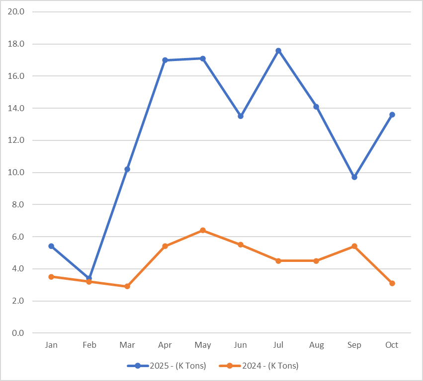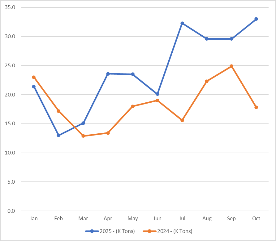 The October figure adds to a total of 241 thousand tons exported this calendar year, and 206 thousand tons crop year (April – now) so far. This number is already enough to put 2025 on the top 5 years for kernels export volume wise, and we still have two months to go.