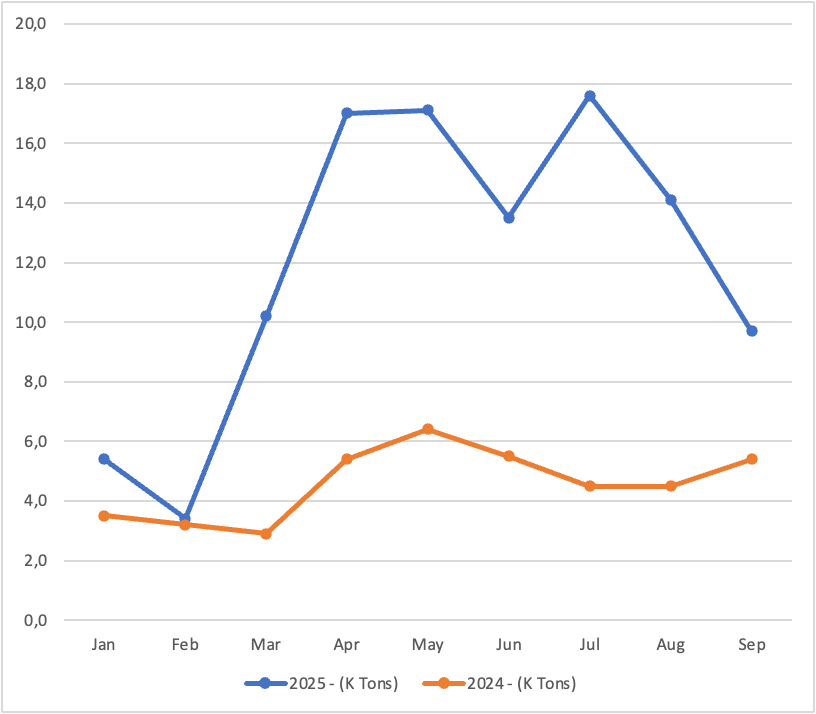 During September, Brazil exported about 30 thousand tons of peanuts, this represents a 19 % increase compared to September 24, and no change compared to August 25. Although China decreased its imports, EU, Russia and Algeria have picked up the numbers and maintained the exports at their level, which is very good for Brazil. Still China represents 1/3 of the total volume exported this month. (further analysis below)