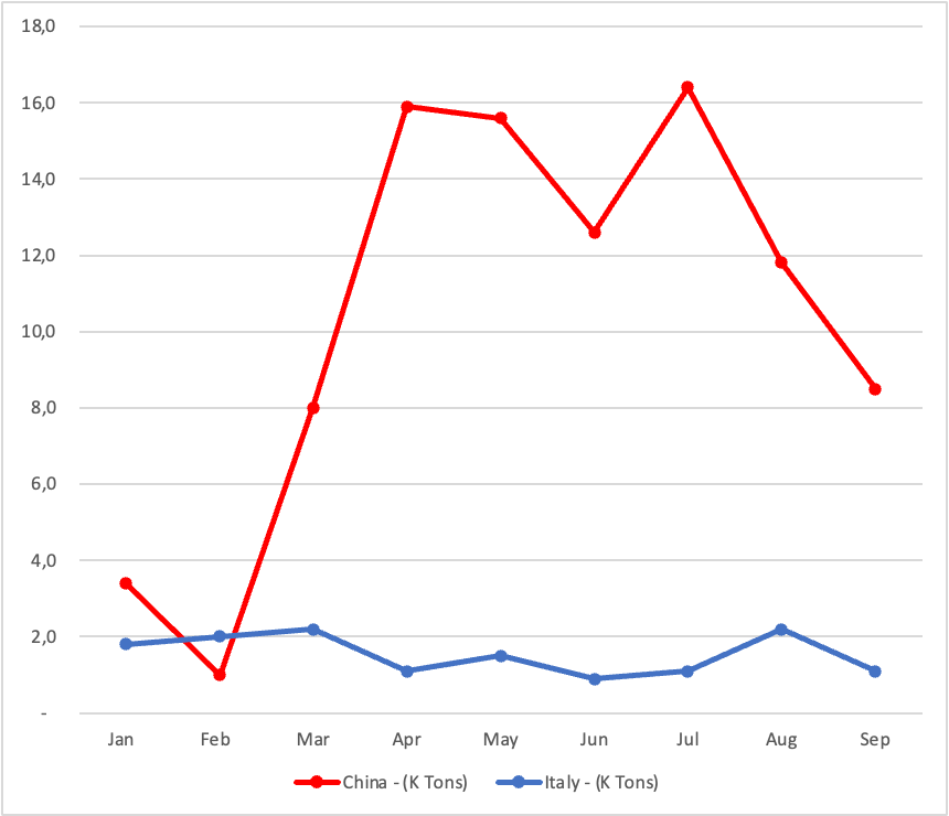 As usual, the fluctuation in peanut oil exports is mostly due to Chinese imports, with 8,5 thousand tons, about 3,5 thousand tons decrease. Italian imports dcropped about 1,1 thousand tons.