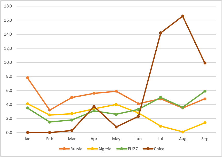 China exports went down dramatically by about 7K tons, while Russia, EU and Algeria went up about 1,5K. While Chinese imports will most likely keep its tendency, it is harder to understand the remaining destinations.